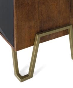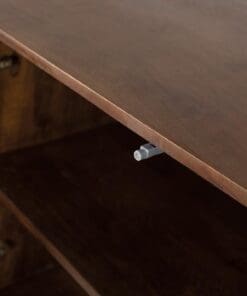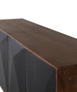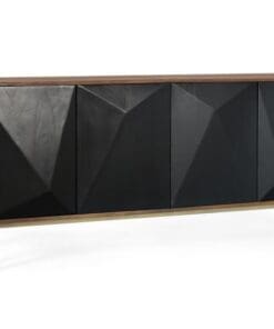 This sideboard stands out for its elegant and contemporary design. It is made of mango wood, with an exterior structure painted in a warm hazelnut tone that highlights the grain. The front of the sideboard is made up of four doors that immediately capture attention. Each one is painted in a refined matte black color and features reliefs with geometric shapes that create a three-dimensional effect. Holding this piece is a minimalist base made from square-section iron tubes, painted in a comfortable shade of gold. This metallic detail not only provides stability and resistance, but also provides a touch of subtle luxury, contrasting harmoniously with the wood.