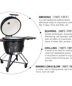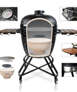 - Rejilla de cocción: Acero inoxidable (diámetro 6 mm acero inoxidable) Anillo de fuego / Caja de fuego: Mullita (Resistente a 1000 grados) Cúpula de parrilla/Base de parrilla: Mullita (Resistente a 1000 grados).