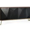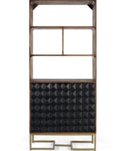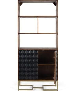 This elegant bookcase is made of mango wood, a robust and durable material that stands out for its natural grains. Its entire structure is finished in hazelnut color. The design has three open shelves, offering space to organize decorative objects or books. At the bottom, two doors with an interior shelf in matte black. The doors are covered with a design of geometric figures in the shape of a diamond tip, creating a three-dimensional effect that adds texture and visual depth to the furniture.