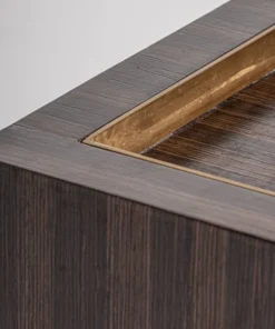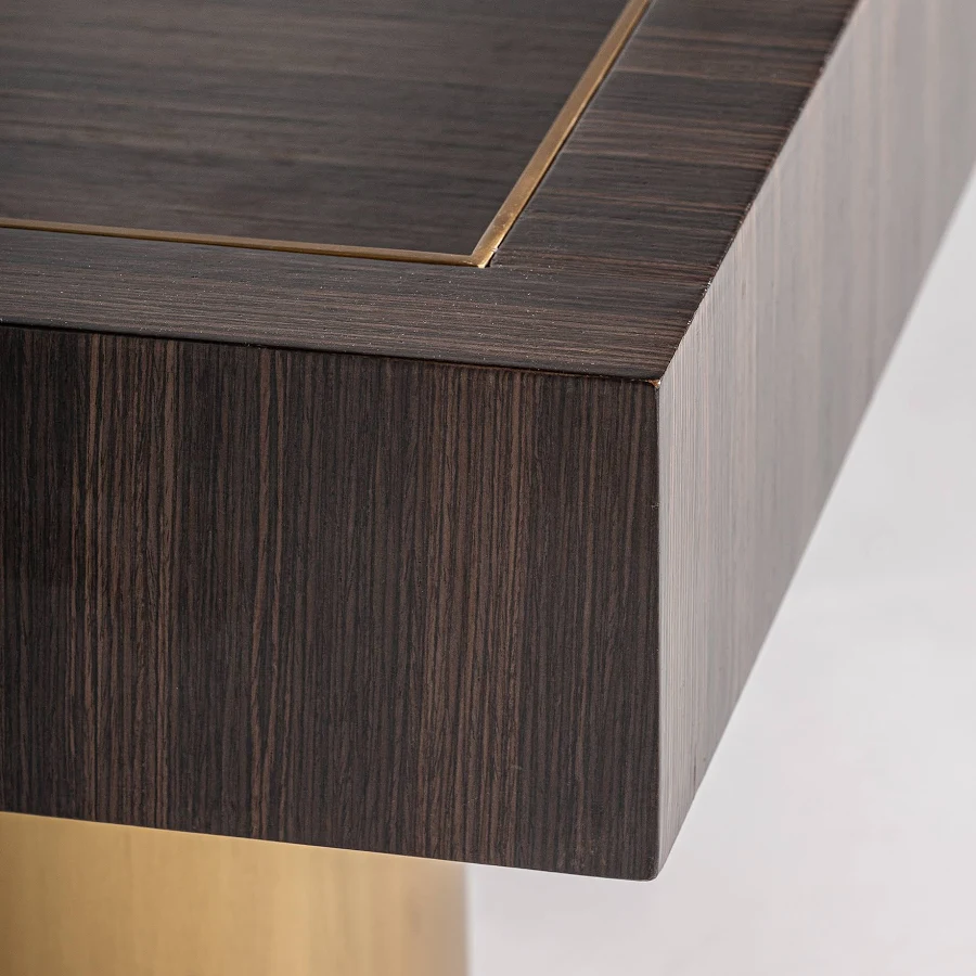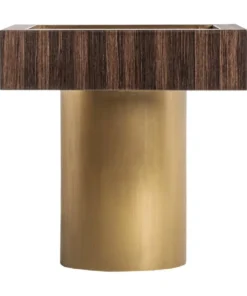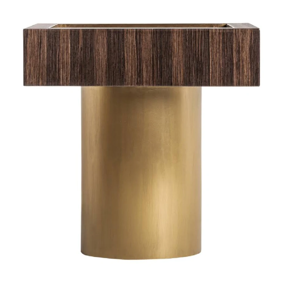 La mesa auxiliar Cheb combina madera de pino, acero dorado y contrachapado en una pieza art déco de contrastes equilibrados.