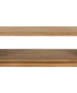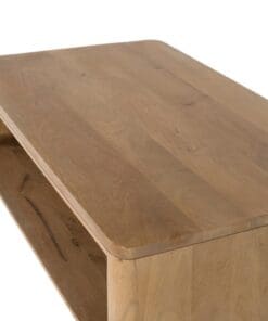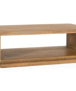 Coffee table made of mango wood in natural color, with a design of clean lines and rounded corners that highlight its modern and cozy style. Its large surface area makes it ideal to complement any space, and it has a practical integrated magazine rack that offers additional and organized storage. Natural wood details provide an elegant balance between functionality and minimalist aesthetics.
