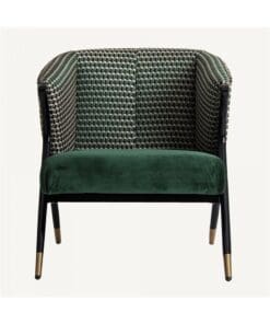 De inspiración Art decó y estilo moderno, cómodo y confortable, se compone de un cojín elaborado en terciopelo de color verde y un respaldo con estampado de formas geométricas. Los acabados del sillón en madera y acero apuestan por la elegante combinación de tonos negro y dorado.