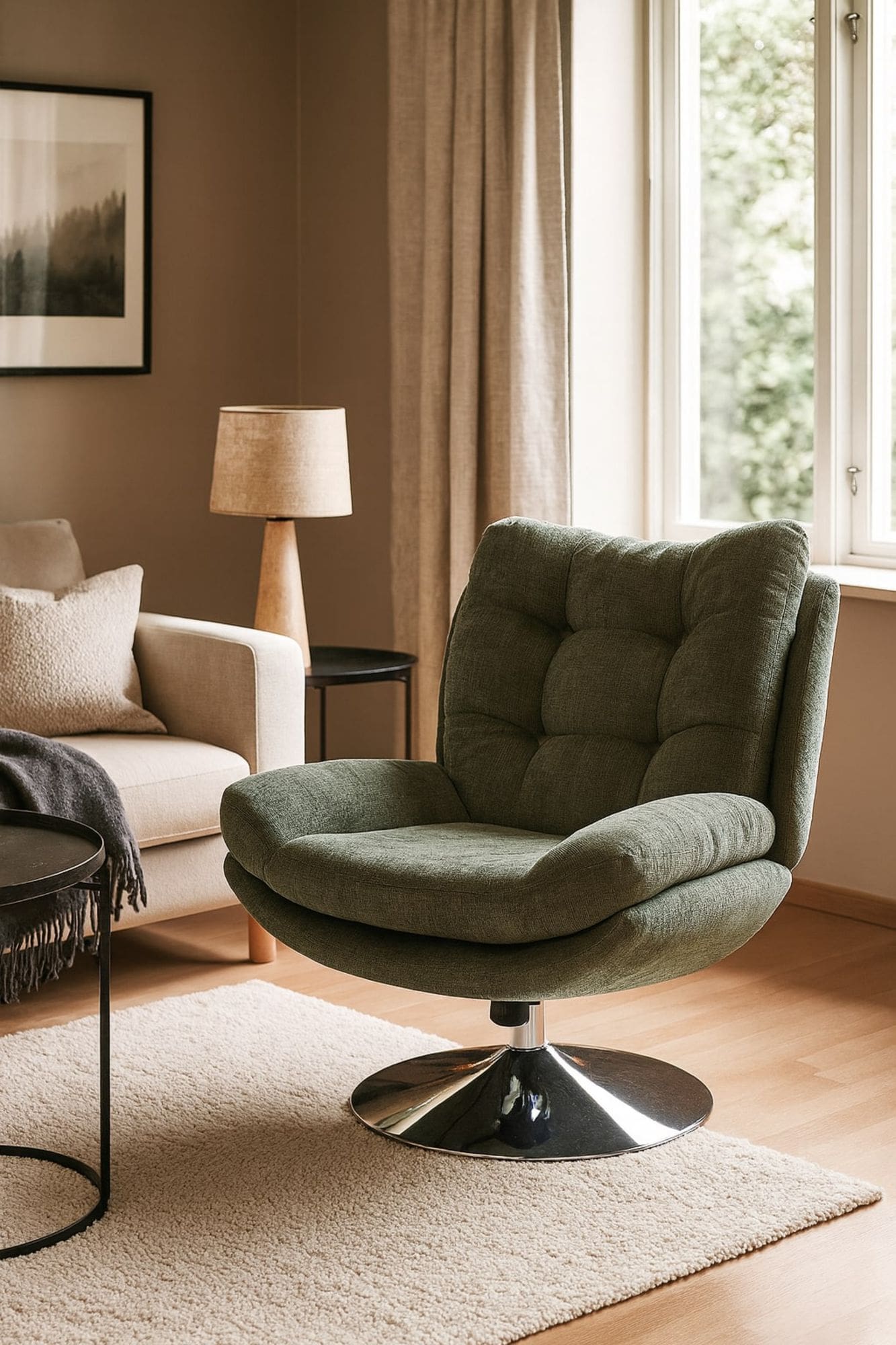 - La silla « Magnum » presenta un diseño contemporáneo, tapizada en tejido de poliéster verde oscuro con espuma de alta densidad para un confort óptimo.