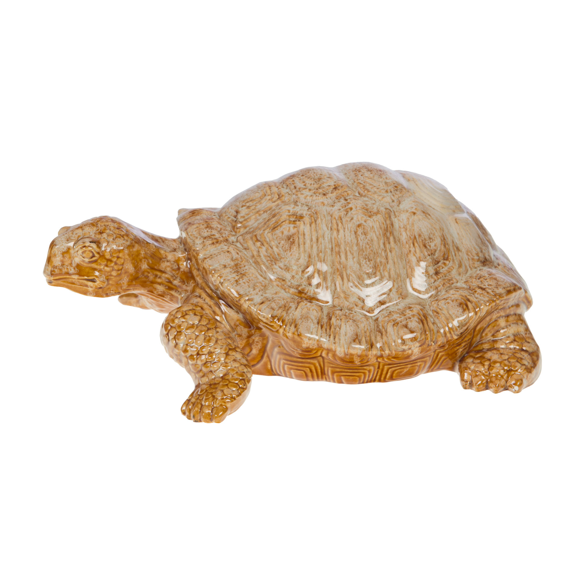 - Esta figurita decorativa de cerámica esmaltada en marrón representa una tortuga.