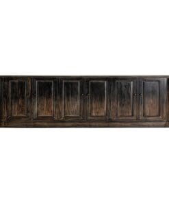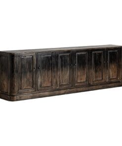 - El aparador Svanhild, fabricado en madera de pino reciclado, destaca por su acabado en tonos marrón y su estética colonial.
