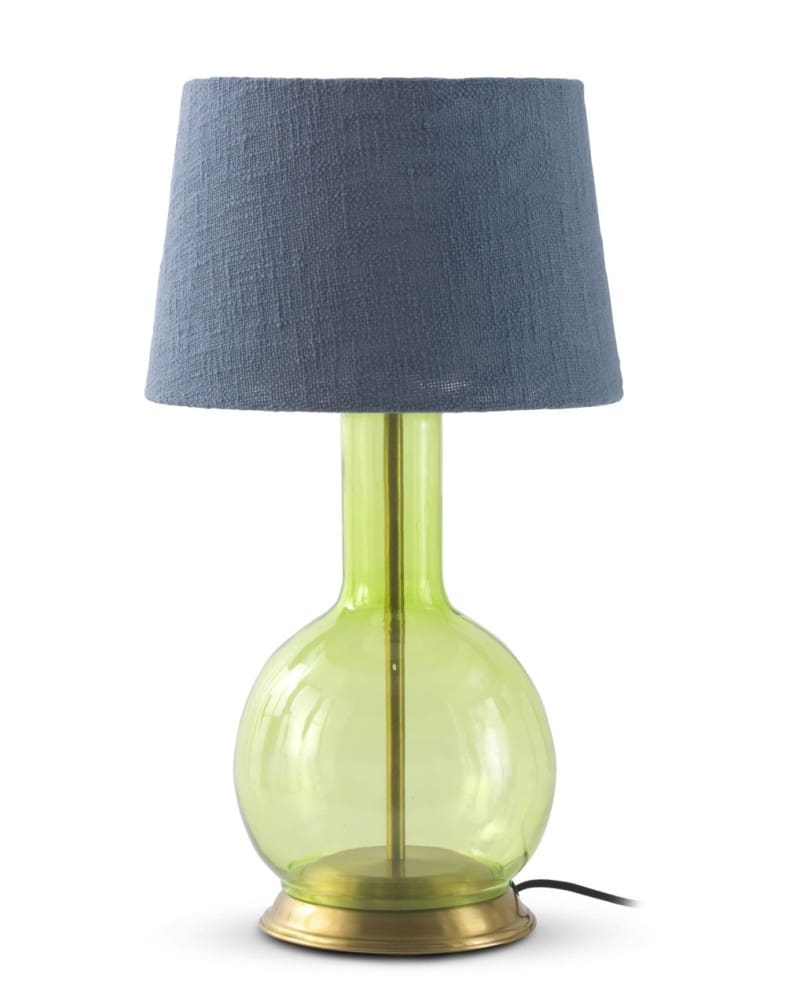 LAMPARA DE SOBREMESA CRISTAL VERDE CON TULIPA DE ALGODON AZUL