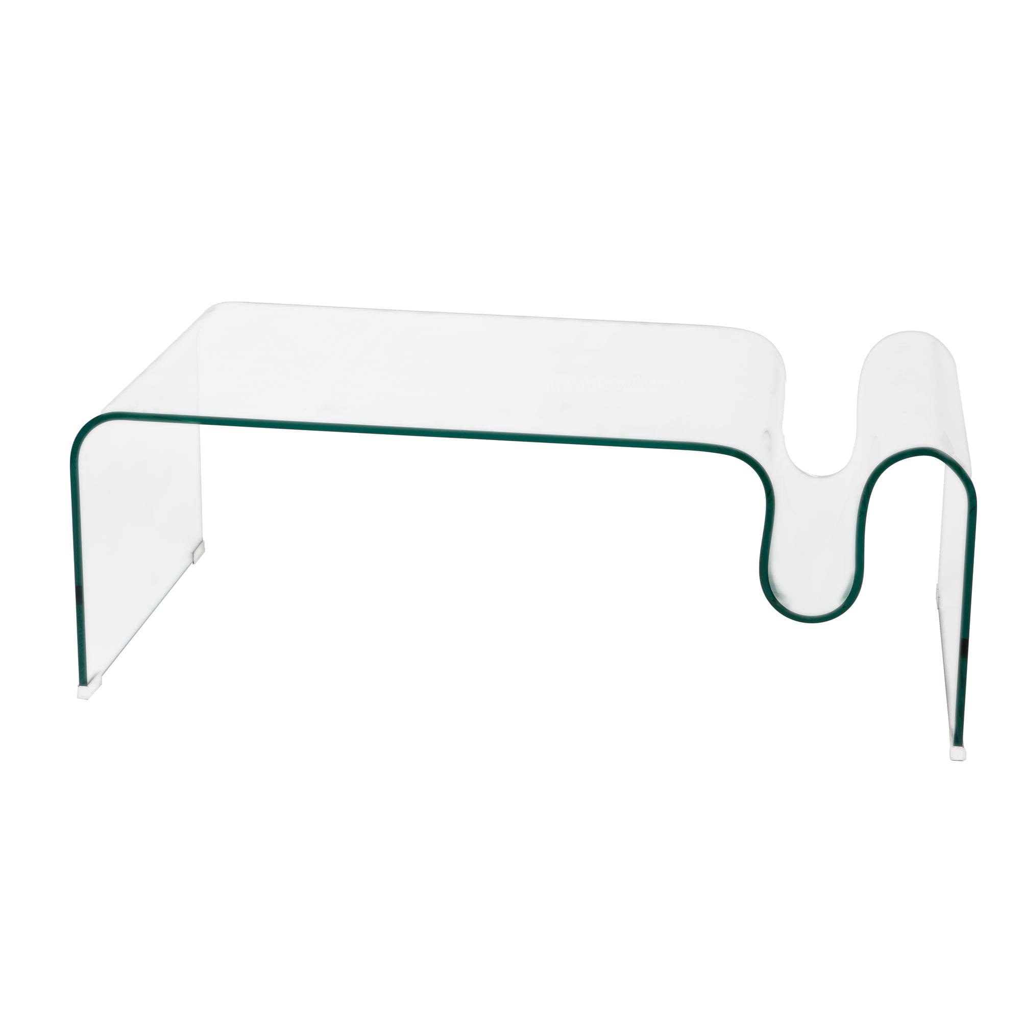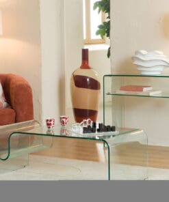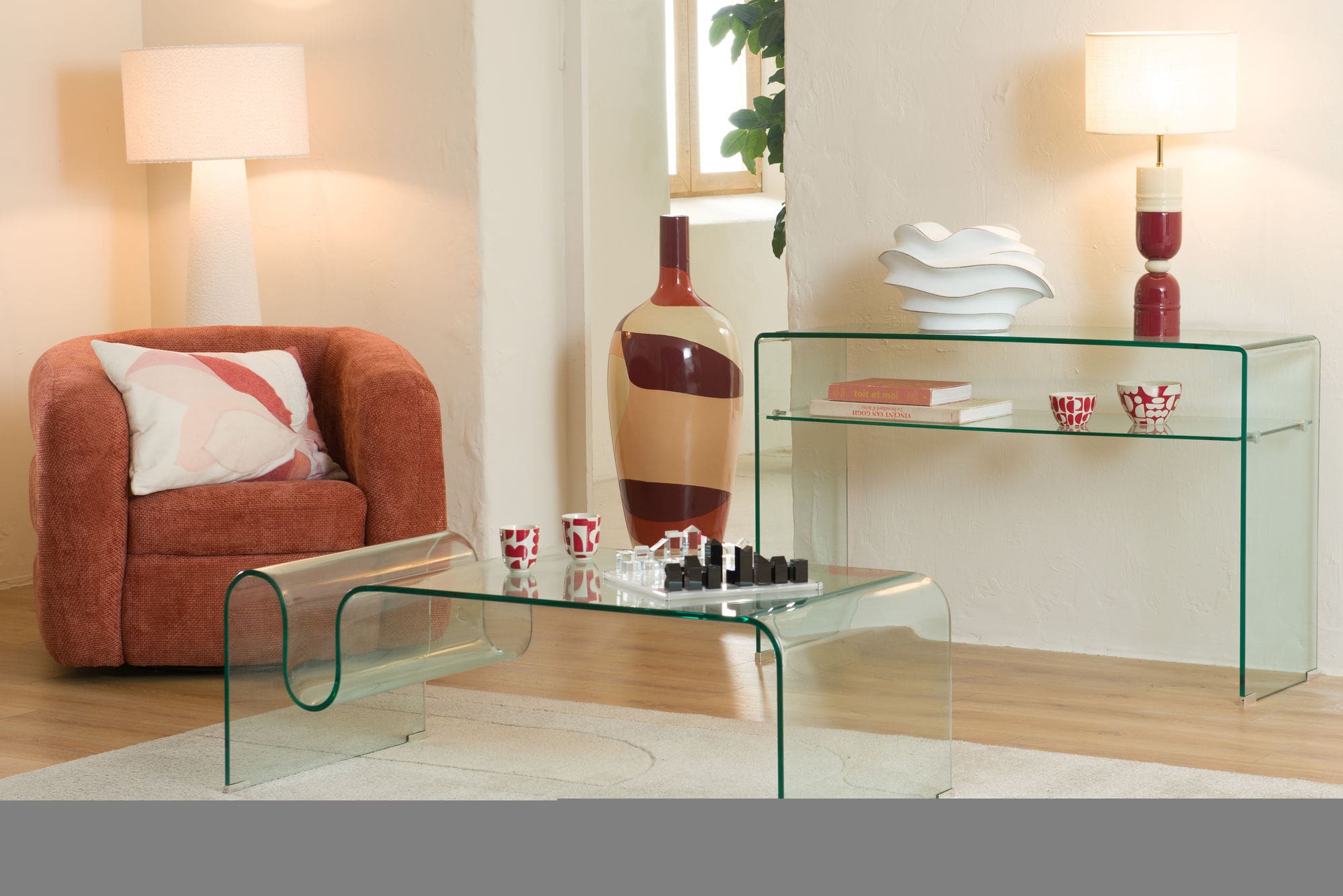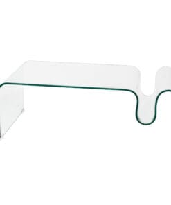 Mesa de café de vidrio no templado con un diseño original en forma de ola, dimensiones 120x60x42 cm. Esta pieza contemporánea cautiva con su estética fluida y minimalista, ideal para enriquecer una colección de muebles modernos. Su estructura monobloque de vidrio curvado ofrece ligereza visual y robustez, perfecta para una clientela que busca innovación y elegancia en el mobiliario interior.