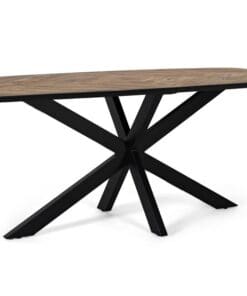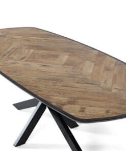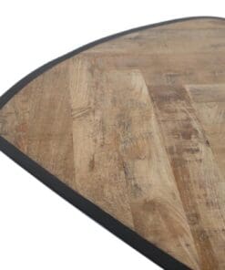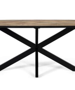 Con un diseño sofisticado y materiales de alta calidad. Su tablero rectangular con esquinas suavemente redondeadas está elaborado en madera natural con diseño de parquet en patrón chevron, ofreciendo un acabado elegante y distintivo que resalta la veta de la madera. El contorno está enmarcado con un borde oscuro que añade contraste visual y refina el conjunto. La estructura de soporte está fabricada en hierro negro, con un diseño en “X” estilizado que aporta gran estabilidad y un toque contemporáneo e industrial al espacio.