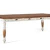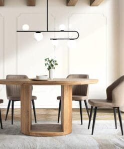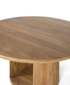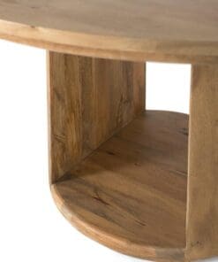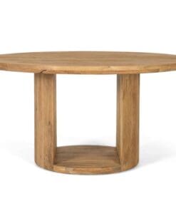 La mesa tiene un diseño elegante y robusto, con una tapa redonda y gruesa, hecha de madera de mango de alta calidad. La superficie muestra una rica textura con vetas visibles, lo que le da un carácter único. La base destaca por una abertura central que le da un aire ligero, los dos laterales son amplios, con un grosor que resalta la fuerza de la mesa. Este diseño combina funcionalidad y estilo, siendo ideal para reuniones amplias y espacios modernos o rústicos.