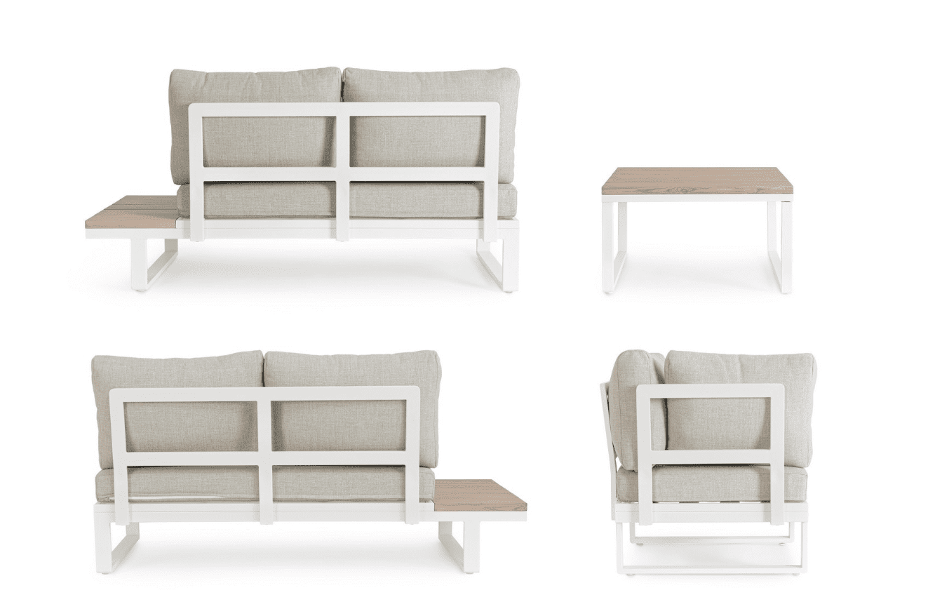 - LATERALES DEL SOFA’ Y TABLERO DE LA MESA CENTRO DE ALUMINIO BARNIZADO EFECTO MADERA.