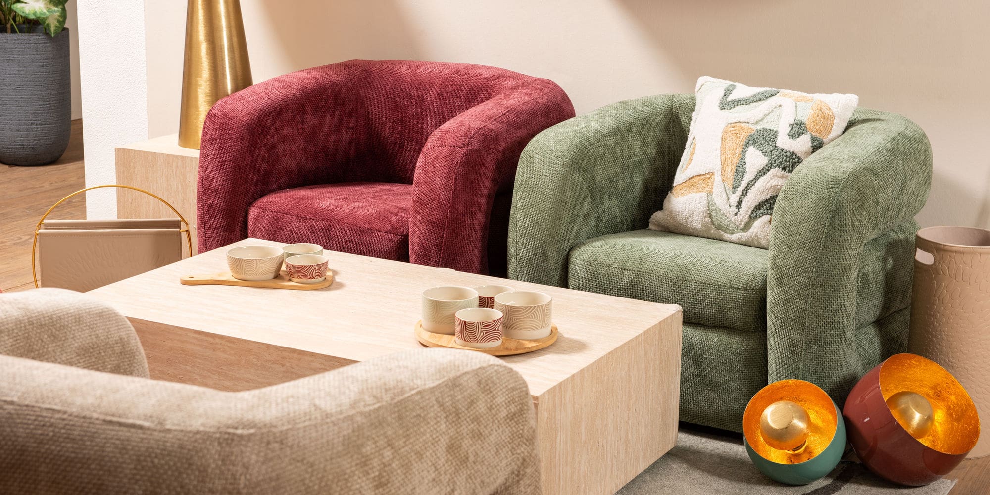 - La silla Bess en tejido rojo profundo con estructura de madera ofrece un diseño contemporáneo y un confort óptimo.