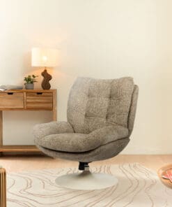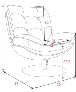 - Su base giratoria blanca de metal asegura estabilidad y modernidad. Con dimensiones generosas (78x90x100 cm), es adecuada para diversos espacios.